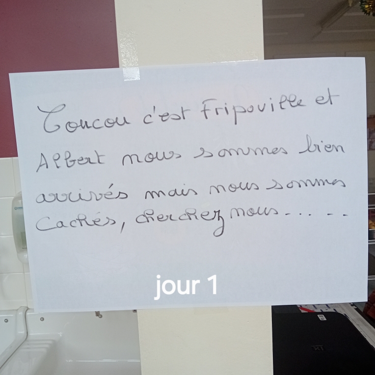 Chaque jour de cantine ils font une bêtise, les enfants adorent chercher dans la cantine ce que les petits coquins ont pu préparer pour les faire rire : Ils se sont cachés dans le sapin, ils ont emballé la fontaine à eau et mis tous les pichets à eau à l’envers. Ils se sont pris en photo avec la photocopieuse puis ils se sont envolés au plafond avec des ballons, ils ont aussi décoré le sapin avec du papier toilette et s’en sont entourés et ils ont fait des dessins sur des oeufs.